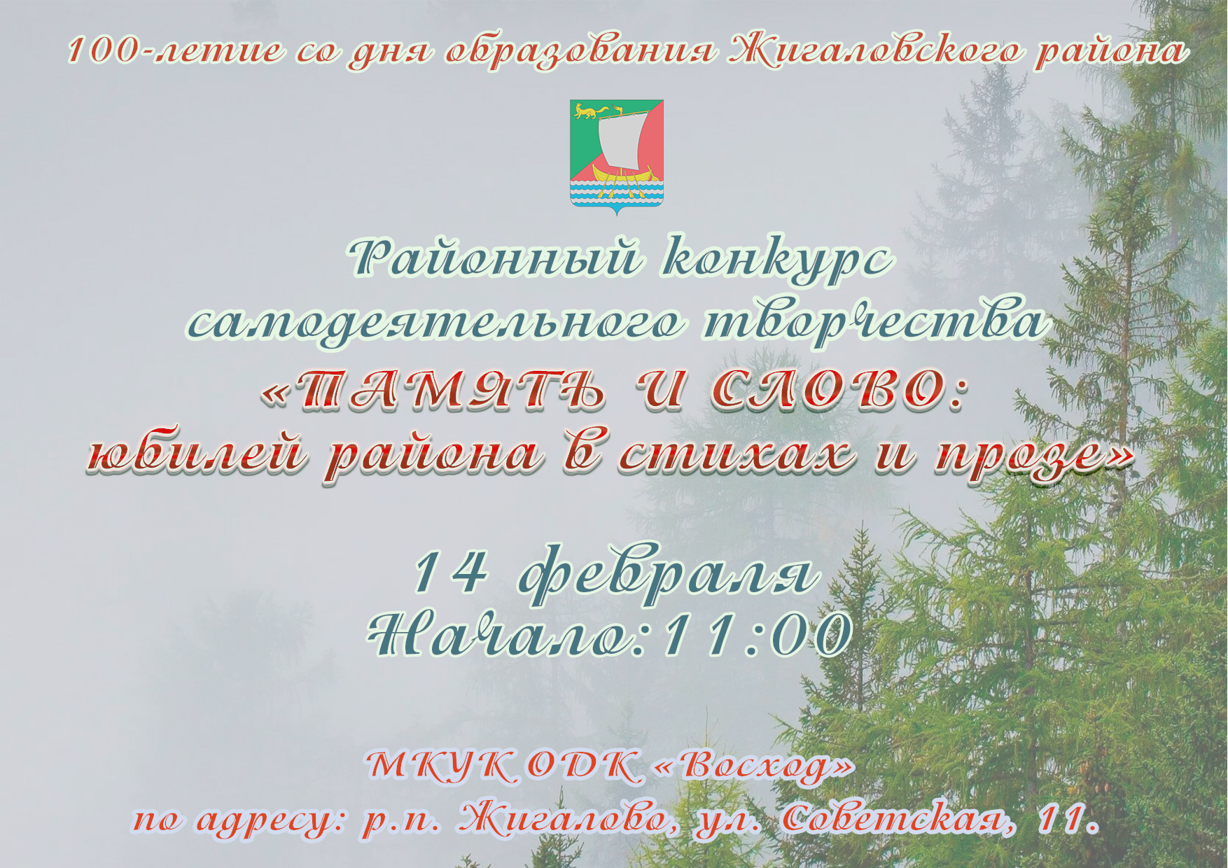 Приближается знаменательная дата - 100-летие со дня образования нашего Жигаловского района! Это вековой рубеж, наполненный богатой историей, яркими событиями и, конечно же, людьми, которые своим трудом и талантом создавали его облик. В честь этого грандиозного юбилея мы приглашаем вас, дорогие земляки, принять участие в уникальном творческом событии - Районном конкурсе самодеятельного творчества «Память и слово: юбилей района в стихах и прозе»!